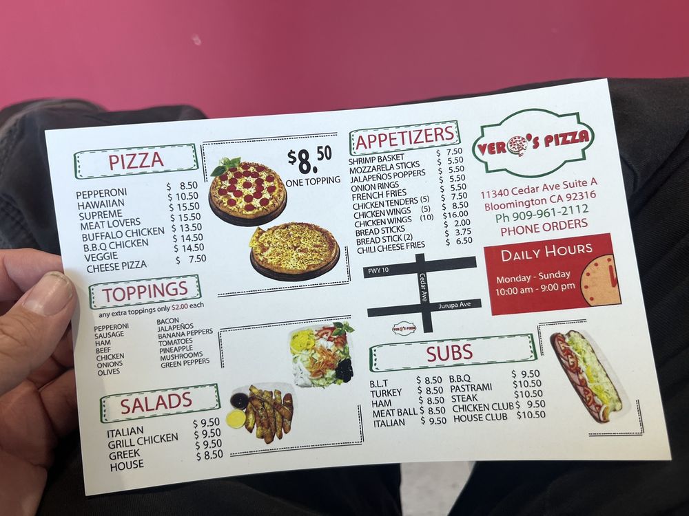 Welcome to Vero's Pizza, your new go-to destination for delicious, handcrafted pizzas in Bloomington, CA. Located at 11340 Cedar Ave, this casual eatery offers a delightful blend of classic favorites and unique creations. Whether you're seated in the cozy outdoor area or dining inside, the warm atmosphere is perfect for groups and gatherings.